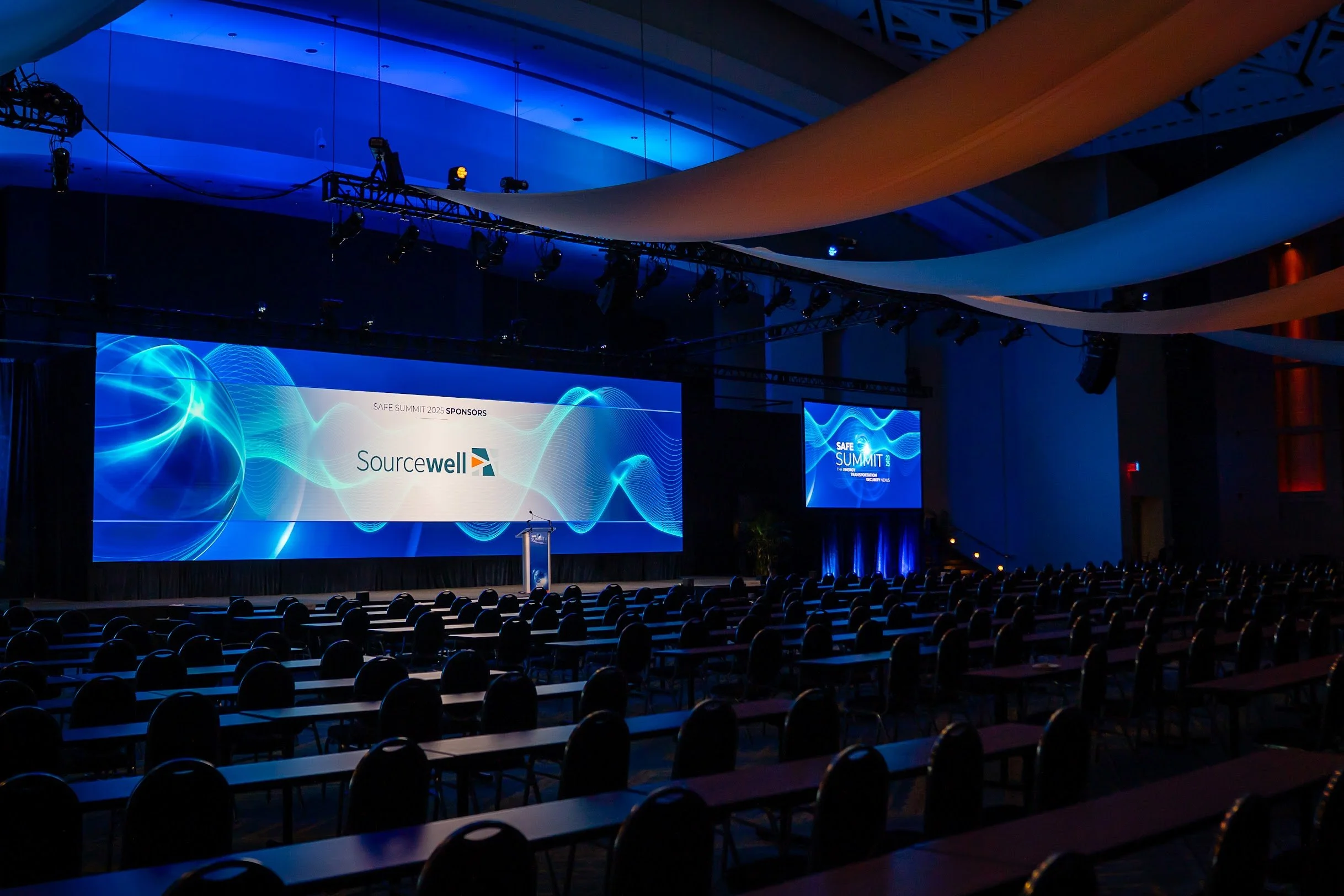 For the General Session, our designers designed a stage with a large LED wall backdrop and used softgoods as swags in the ceiling to cut down the height of the space for a more intimate setting. The stage is designed to cooperate with the existing architecture.